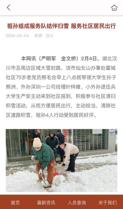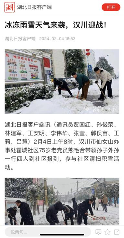 2024年2月起,湖北多地受到罕见的受到大风、冻雨、冰雹等极端天气影响,路面出现低温冰冻现象,为了消除冻雨天气带来的安全隐患,保障群众的安全出行,信息工程学院软件工程专业2021级严安同学不畏严寒、率先垂范,志愿投身于铲雪工作一线,为切实保障居民出行安全清理出了一条“安全”通道。其事迹被多家媒体报道。
