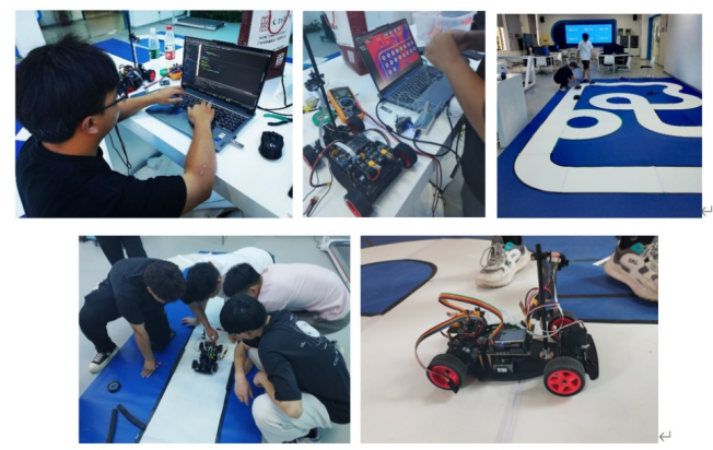 在时间和场地条件比较紧张的备赛过程中,胡朝杰、江镇彪、卢博伦同学在上官松老师指导下,从智能车的控制和驱动电路设计设开始,到智能车编程算法、赛道识别的灰度图二值化巡线补线、电机驱动控制PID参数的调整,开展了大量的设计和调试工作。在多元素PVC赛道的十字路口、弯道、大小圆环、S形弯道、路障等每个跑道元素点位对赛车人工助推或电机驱动,测试赛道识别和自动驾驶效果,严格校正数据和调整参数,迭代出多套参数组合方案,力求赛车的各项指标达到最佳平衡水准。
