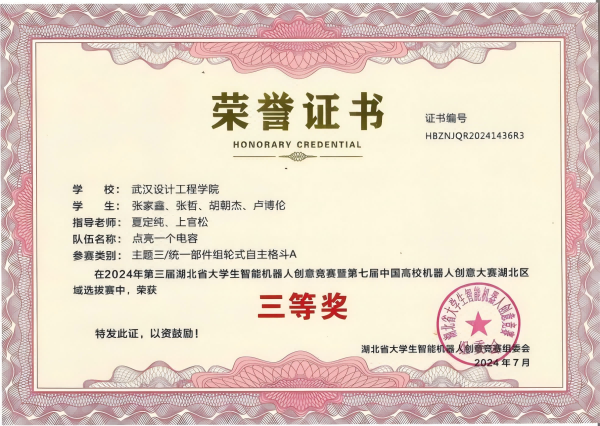 在武汉工程大学举行的第三届湖北省高校智能机器人创意竞赛中,张家鑫、张哲、胡朝杰、卢博伦同学获得“统一部件轮式自主格斗”赛项的团体三等奖。
