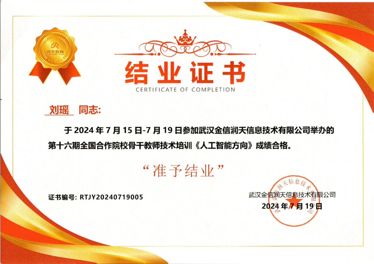 2024年7月15日至19日,陈学文、刘瑶参加了武汉金信润天信息技术有限公司举办的人工智能技术研修活动。本次培训涵盖了机器学习、深度学习、算法优化等前沿技术,专家讲解深入浅出,帮助参训人员加深了对人工智能技术的理解。实践环节通过实际操作,解决了教学中的一些疑难问题,增强了技术应用的直观感受。此次培训不仅拓宽了两位教师的学术视野,也激发了他们对人工智能教育的热情,为今后的教学工作提供了新的思路和方法。