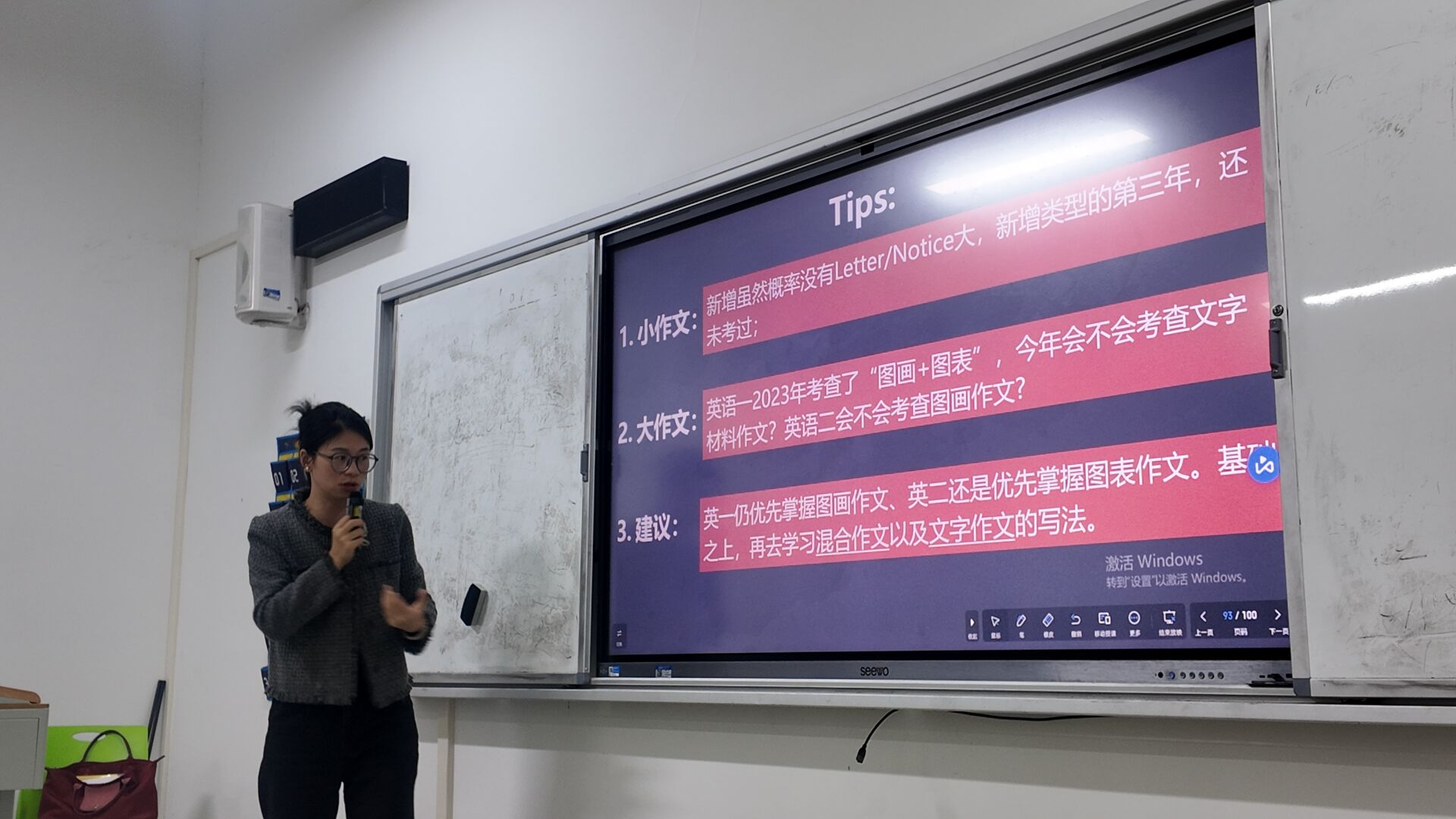 最后,郭宁老师详细讲解了考研英语各个题型的分值和数量,并分享了实用的解题技巧,使同学们对考试结构有了更加清晰的认识。针对单词记忆也传授了多种高效记忆方法,帮助同学们在短时间内快速扩大词汇量。针对作文,她还提醒同学们要关注社会热点、积累写作素材,以写出有深度、有观点的佳作。