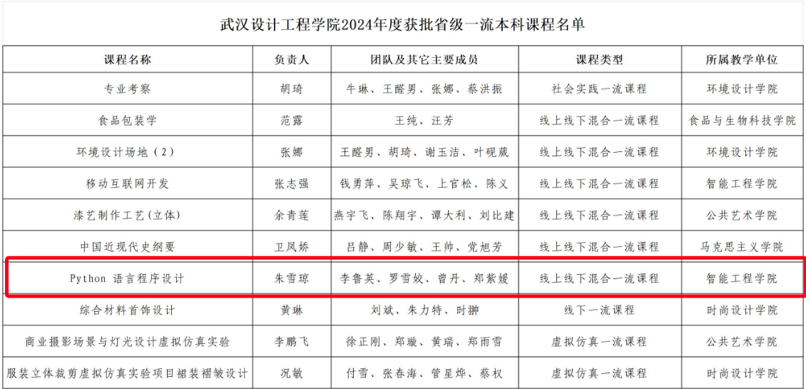(通讯员:朱雪琼)近日,《省教育厅发布省教育厅关于公布2024年度省级一流课程认定结果的通知》(鄂教高函〔2024〕25号)正式公布2024年度省级一流本科课程认定结果,我院的《Python语言程序设计》课程获批省级一流本科课程。