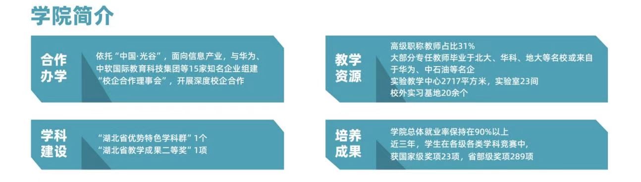 学院建设卓有成效,获批“湖北省优势特色学科群”,获得“湖北省教学成果二等奖”1项。近三年,学院教师主持省级教学、科研项目10项;学院学生获批国家级、省级大学生创新创业训练计划项目19项。近三年,在蓝桥杯全国软件专业人才设计与创业大赛、华为ICT大赛、智能机器人格斗大赛等各级各类学科竞赛17项,获得国家级奖项23项,省部级奖项289项。近三年,学院总体就业率保持在90%,其中专业就业率达93.5%。学院毕业生的就业质量也稳步提升,大部分毕业生就业于北京、上海、广州、深圳、武汉等一二线城市,不少优秀毕业生进入阿里巴巴、亚马逊、华为、微软、海康威士、国泰君安、法雷奥集团、科大讯飞等知名业内企业。