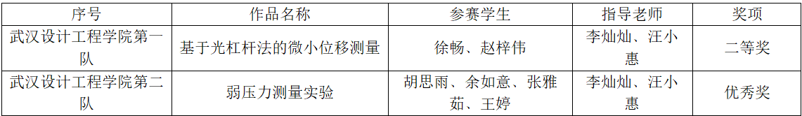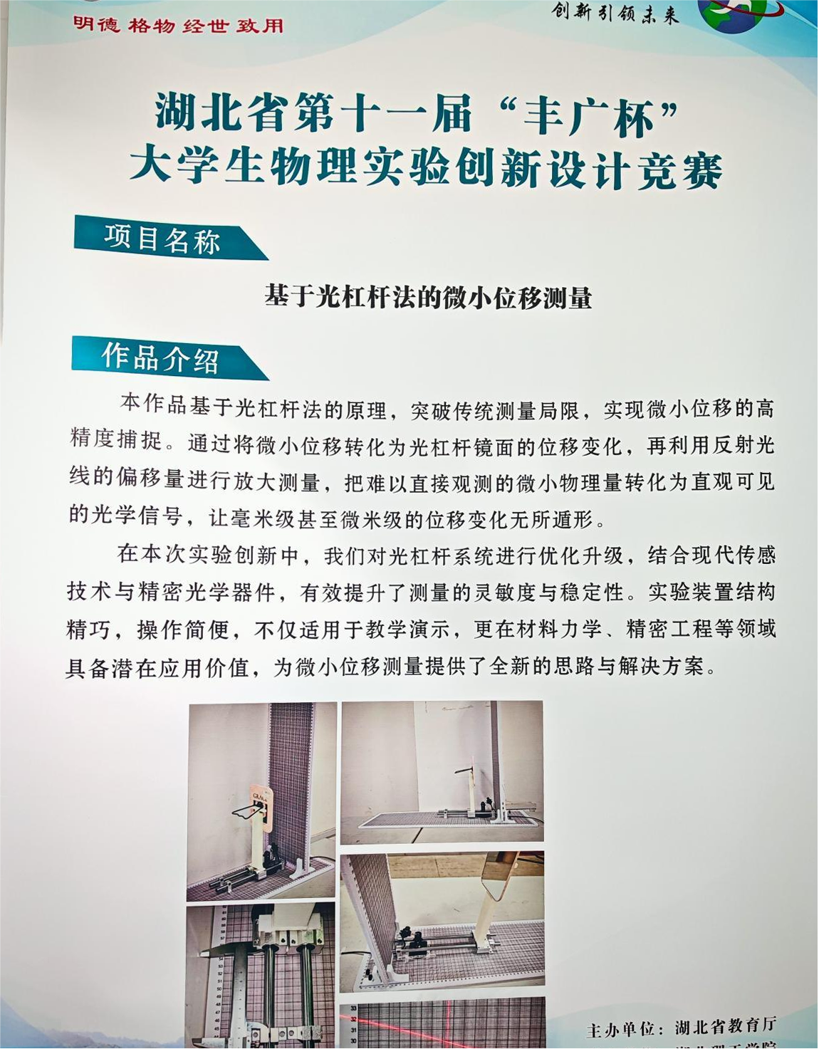 (通讯员:徐畅)近日,湖北省第十一届“丰广杯”大学生物理实验创新设计竞赛于湖北理工学院圆满落幕,我院第一队徐畅﹑赵梓伟凭借出色的表现,其作品“基于光杠杆法的微小位移测量”,斩获湖北省省级二等奖佳绩,第二队胡思雨,余如意,张雅茹,王婷其作品“弱压力测量实验”斩获湖北省优秀奖。