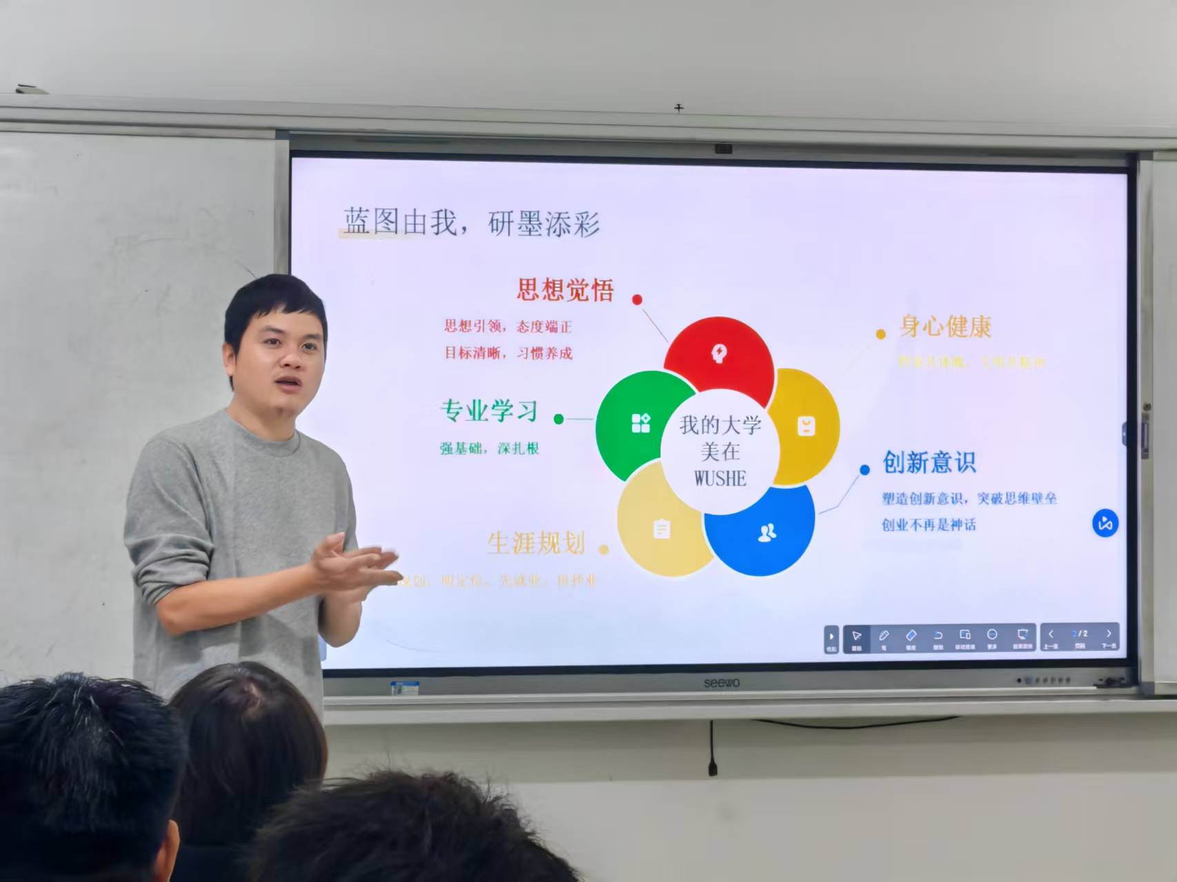 其中,计算机科学与技术2302班的班会呈现出一场结构严谨、内容丰富的“赋能班会”。班主任吴琼飞老师以“五维赋能,绘制卓越蓝图”为主题,为同学们进行了一次系统性的学业导航。吴琼飞从“思想觉悟”“专业学习”“生涯规划”“身心健康”和“创新意识”这五个维度出发,各点相互支撑,共同构筑了一份立体而丰满的学业发展蓝图。