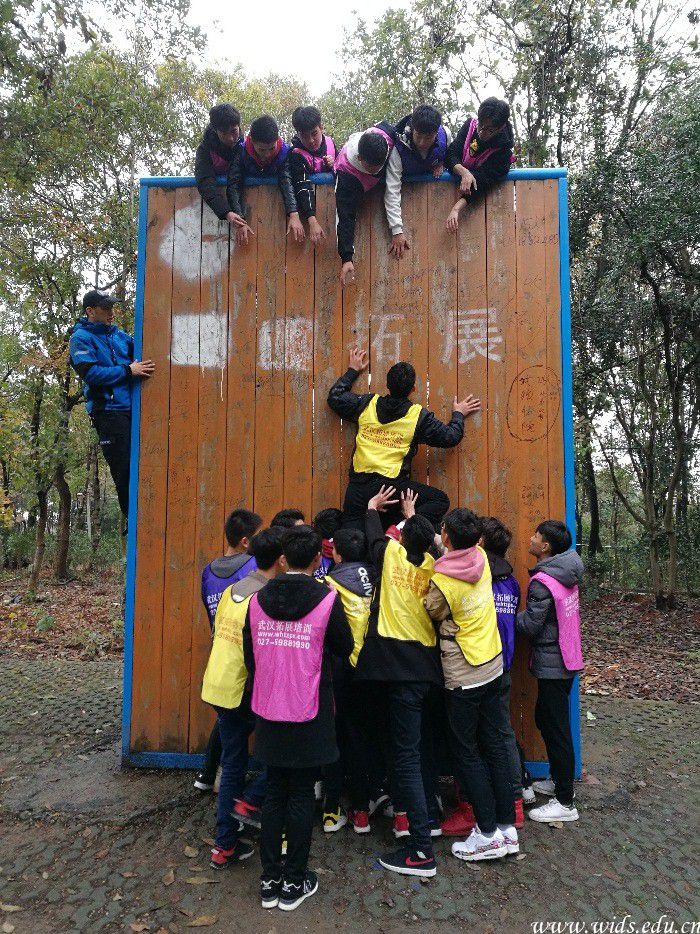 在本次素质拓展中,团队成员被分成3组,每组13名成员,每个组经过讨论制定出自己队伍的名称、口号和队歌,并选出组长和政委,先后参加了“智慧翻牌”、“闯三关”、“挑战150”、“极限60秒”和“毕业墙”等五个项目。其中“逃生墙”最为艰难和精彩,面对4.2米的高墙,全部成员需在不借助任何工具的情况下爬上那座墙,在大家的努力下成功完成了任务,且远远超出大家的期望。
