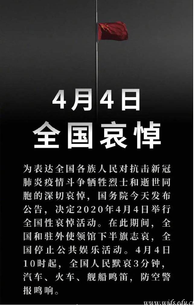 今天是4月4日清明节,为表达全国各族人民对抗击新冠肺炎疫情斗争牺牲烈士和逝世同胞的深切哀悼,国务院决定在 2020年4月4日的今天举行全国性哀悼活动。在此期间,全国和驻外使领馆下半旗志哀,全国停止公共娱乐活动。4月4日10时起,全国人民默哀3分钟,汽车、火车、舰船鸣笛,防空警报鸣响。
