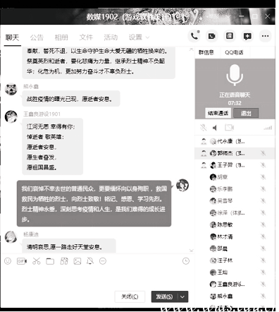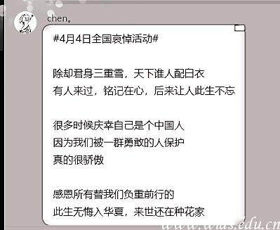 王嘉璇:今天,我们怀着无比沉痛的心情,开展这一次线上班会,2020年4.4日,是一个送别我们逝世同胞,送别英勇抗疫烈士的日子,在这个日子,我们每个人都怀着无比沉痛的心情,但是,我也希望,借着今天,让我们明白,今天的日子是多么来之不易,我们之所以平安生活,是因为有人替我们负重前行!