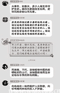 张家槐同学:从一月份开始,直到三月24日那一天,我看着数据慢慢清零,真的无比感动,但是我也知道,这是无数医护人员,冒着生命的风险去换取来的,李文亮医生,是这个群体中的典型,也有着更多无数医护人员如同李医生奋战,不计牺牲,不怕死亡,才将一个又一个生命从死神的手中拉了回来,但是,381位一线烈士的离去,也让我们无比沉痛,他们,是中国最可爱最英勇的人,他们的闭眼,换来的,是无数个患者从病床苏醒的那一眸睁眼,他们,随着牺牲同胞们一起,去了净土,但是,他们留下来的精神,将万古长存!