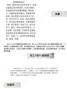 岳勤逸同学:我是一个土生土长的武汉人,这次疫情对我来说,是最直接的冲击,我目睹了千千万万个医疗护士和士兵们的到来,他们不畏生死,就是为了我们共同的家——中国,他们与患者,与我们站在一起,不计牺牲,不论生死,他们每一个人都是英雄,是我们民族的骄傲,我看见了,这些最美逆行者的身影,也让我知道了我们的生活有他们是多么的美好,对于381位烈士的离去,我无比痛心,为了他们我也会好好生活,奋起为中国做些什么。