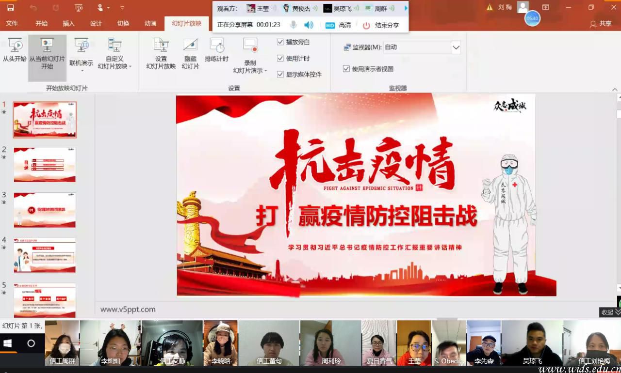 学习完毕,信息工程学院党总支副书记王莹同志带头分享了自己的抗疫经历,她表示“不忘初心,牢记使命”已经深深融入到自己的血液中,在下沉社区的第一时间,自己就主动报名,参与到社区一线,起初的担忧,慢慢地取而代之的是更坚定可以战胜疫情的信念。作为党员,就要带头为人民服务。接着周利玲同志、李鲁英同志也各自分享了自己下沉社区的一些经历,他们都展现出共产党员应有的无惧精神,值得我们大家去学习。其他党员们也分享了各自的抗疫经历与感想,由于很多人都是从武汉回老家,在老家,防止感染他人,都自觉隔离,这也是对抗击疫情最大的支持。
