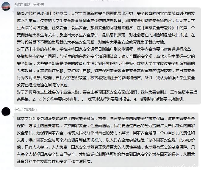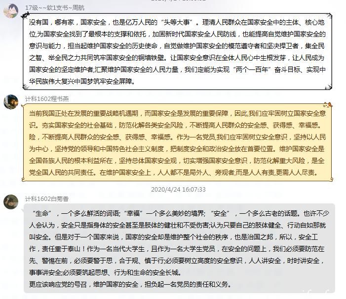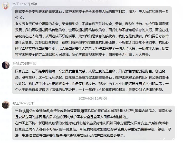 随后,学生党员代表围绕国家安全进行交流发言,分享学习体会。姜玉昆表示:“国家安全是安邦定国的重要基石,维护国家安全是我们所有公民的责任和义务。我们这个时代不是逃避责任,而是要拥抱责任。在专题片里的两个人不同的选择带来了不同的后果,一个人主动自首最终得到了法律的从宽处理,一个一意孤行不知悔改越陷越深,最终受到了法律的制裁。”付玉说道:“国家安全不是停留在嘴上,也不是简单书写在法律条文上,而应刻印在我们每一个人心里,实际落实到行动上。作为一名学生党员,应牢固树立总体国家安全观,切实维护国家安全,勇于向危害国家安全的行为说不。”吴紫倩谈到:“在专题片中的第一个案例就与大学生有关中,反应出大学生安全意识、危机意识淡薄,对社会潜在的风险和危险认识不足。在新时代背景下不断的出现新的大学生安全问题,对当今大学生安全教育提出了新的考验。”严雪倡议:“在维护国家安全上,人人都不是局外人、旁观者,而是人人有责,更需人人尽责。作为当代大学生,要有正确价值观,在思想上牢固树立国家安全意识。”.....与会党员纷纷发表个人学习感想,表达自身对“国家安全”的责任感和使命感。