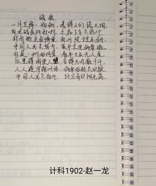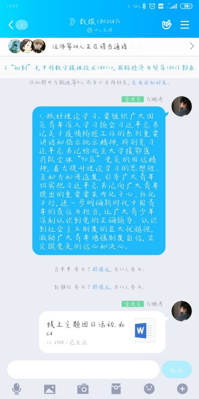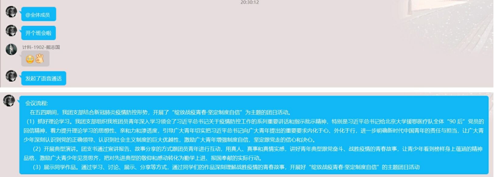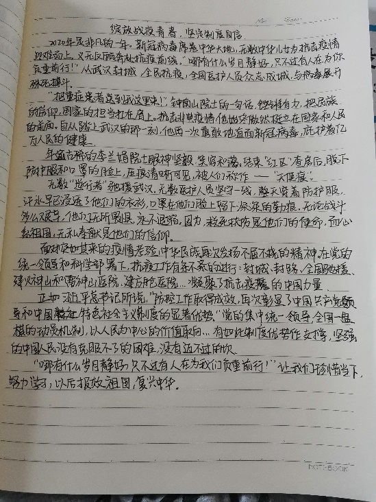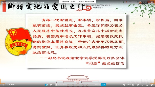 在“绽放战疫青春·坚定制度自信”主题团日活动中,各团员集中深入学习领会习近平总书记关于疫情防控工作的系列重要讲话和指示精神,学习习近平总书记给北京大学援鄂医疗队全体“90后”党员回信精神。然后结合总书记回信重要精神,围绕“对国家抗击疫情采取措施的认识”,团员们根据价值观和责任担当进行交流研讨。部分团员通过自拍小视频、书法、征文等抒发自己跟党奋斗、战胜疫情的青春故事,激励大家见贤思齐,把对先进典型的敬仰和感动转化为勤学上进的实际行动。
