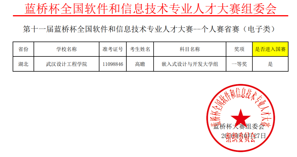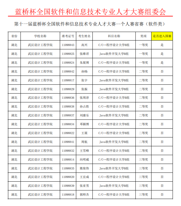 (通讯员 刘艳梅)2020年10月26日,第十一届“蓝桥杯”全国软件和信息技术专业人才省赛传来喜讯,我校信息工程学院学子在比赛中获得湖北省级一等奖4项、二等奖10项、三等奖5项,其中高兴、朱展博、张维君和高瞻等四位同学将获得11月底举行的全国总决赛的资格。