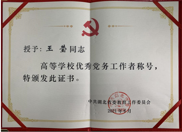 我院党总支书记王莹同志荣获“高等学校优秀党务工作者”称号。