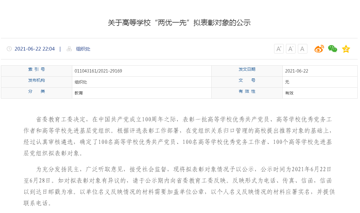 根据省委教育工委决定,在中国共产党成立100周年之际,表彰一批高等学校优秀共产党员、高等学校优秀党务工作者和高等学校先进基层党组织。根据评选表彰工作部署,在党组织关系归口管理的高校提出推荐对象的基础上,经过认真审核遴选、公示。