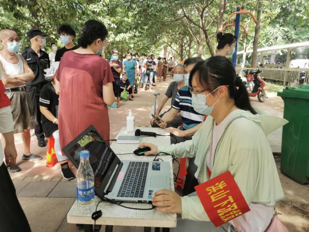 艾静同志在社区登记、录入核酸检测居民信息。