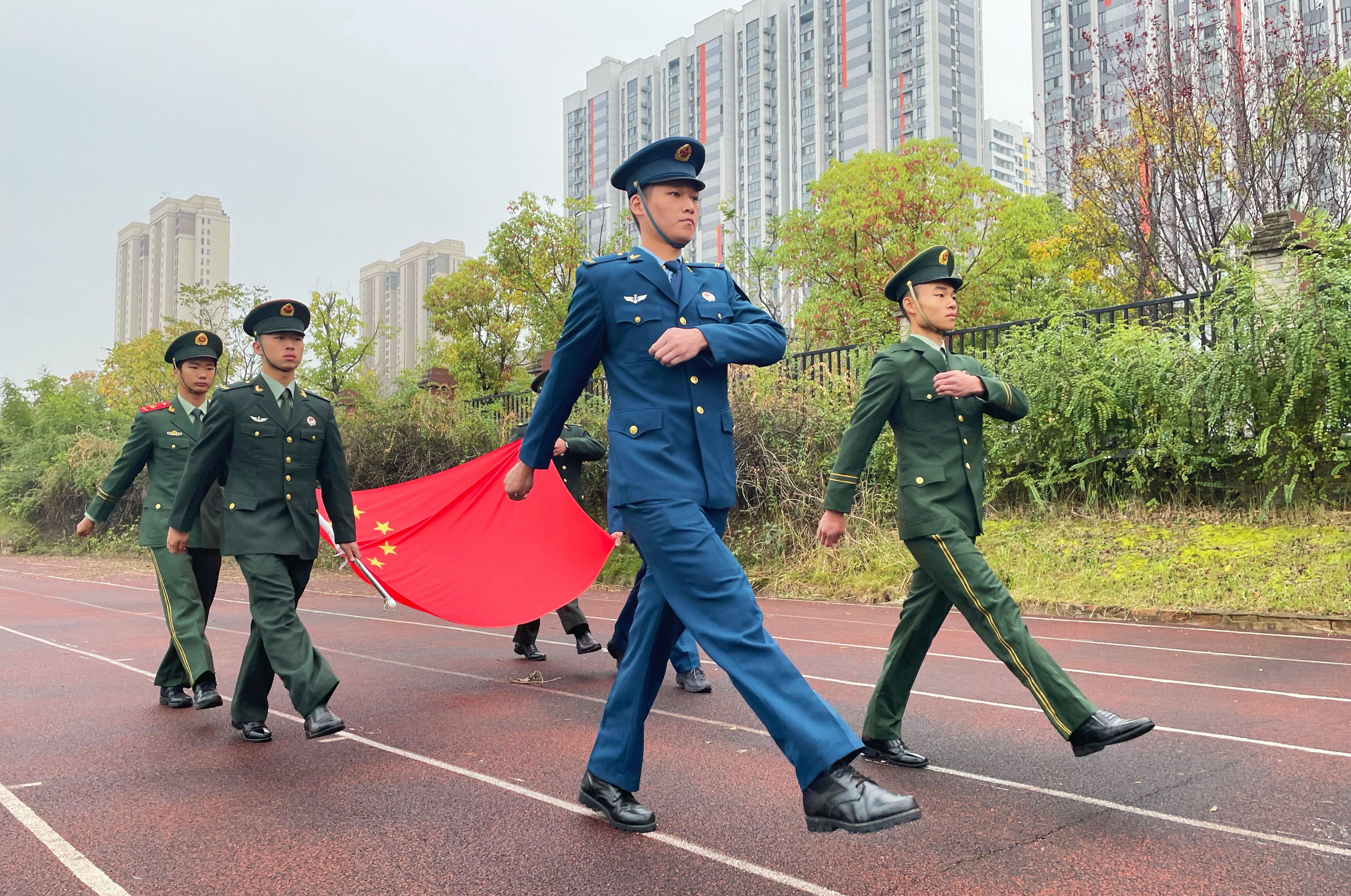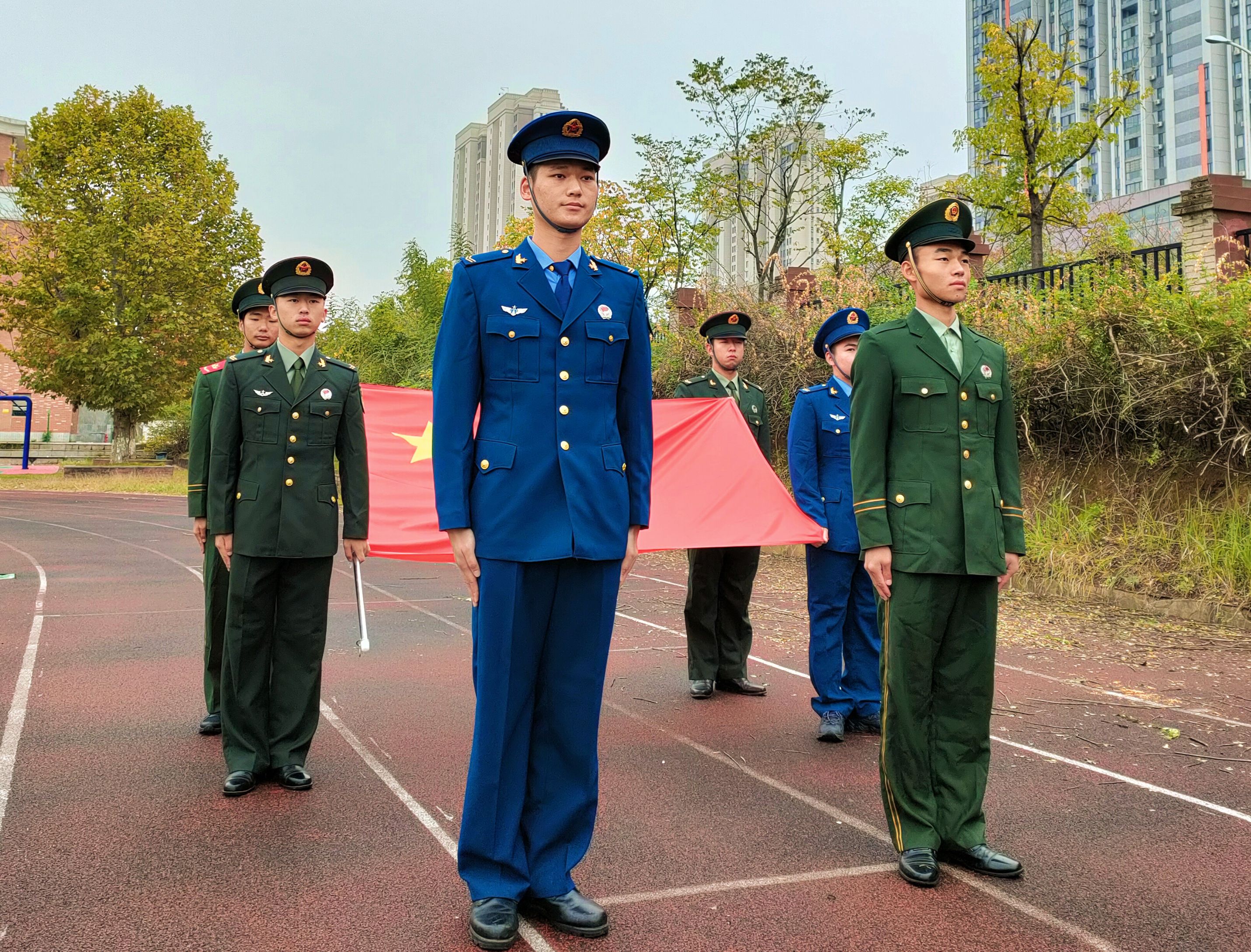 六名旗手都是我院学生中的退伍军人,他们分别来自空军退伍士兵徐睿、龙宇力,陆军退伍士兵严安、高晟恒,武警退伍士兵肖乐、陈明志。他们的每一次迈步,每一声口号,都展示着退伍士兵的自律自强,展示着武设学子的精神面貌,更展示着国旗的耀眼光辉。