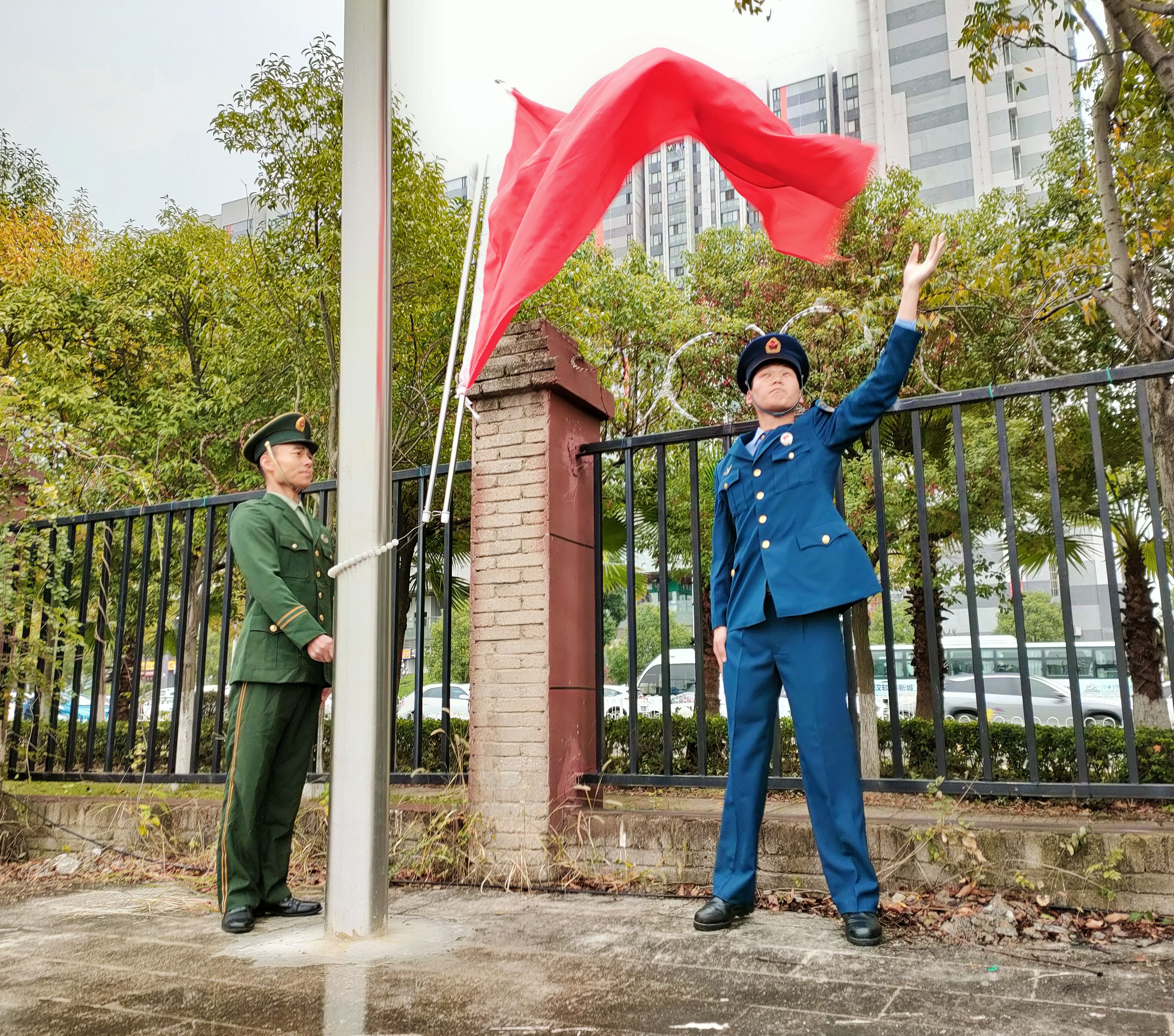 我院的旗手们迎着北风,以饱满的热情,庄严地护卫五星红旗。当雄壮有力的《义勇军进行曲》响彻了整个操场时,同学们集体行注目礼,全场弥漫着一种庄严肃穆的气息。
