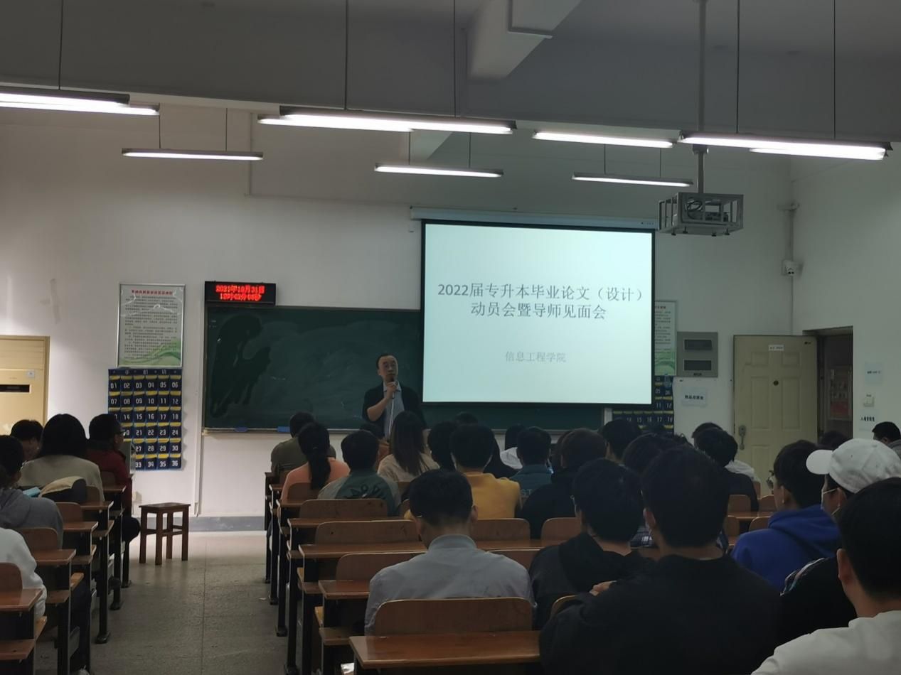 (通讯员 艾静)2020级专升本是信息工程学院招收的第一届专升本学生,为了让学生熟悉毕业论文(设计)的工作过程,提高学生论文质量。我院于2021年10月31日在临湖轩A2059开展了毕业论文(设计)动员大会和师生见面会,会议由信息工程学院院长汪毅主持。