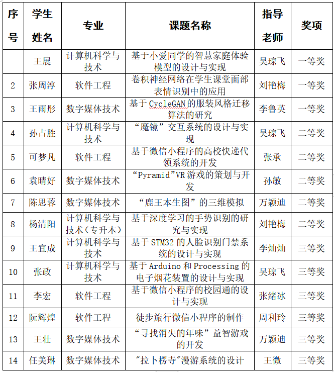 根据学校教务处下发的《关于开展2022届校级本科优秀毕业论文(设计)评选工作的通知》(武设教[2022]16号)文件精神,以及《信息工程学院2022届校级本科优秀毕业论文(设计)评选方案》相关要求,经我院各专业初评推荐,学院校内外评审专家组评审,拟向学校推荐14项2022届校级优秀毕业论文(设计)作品。现将评审结果公示如下: